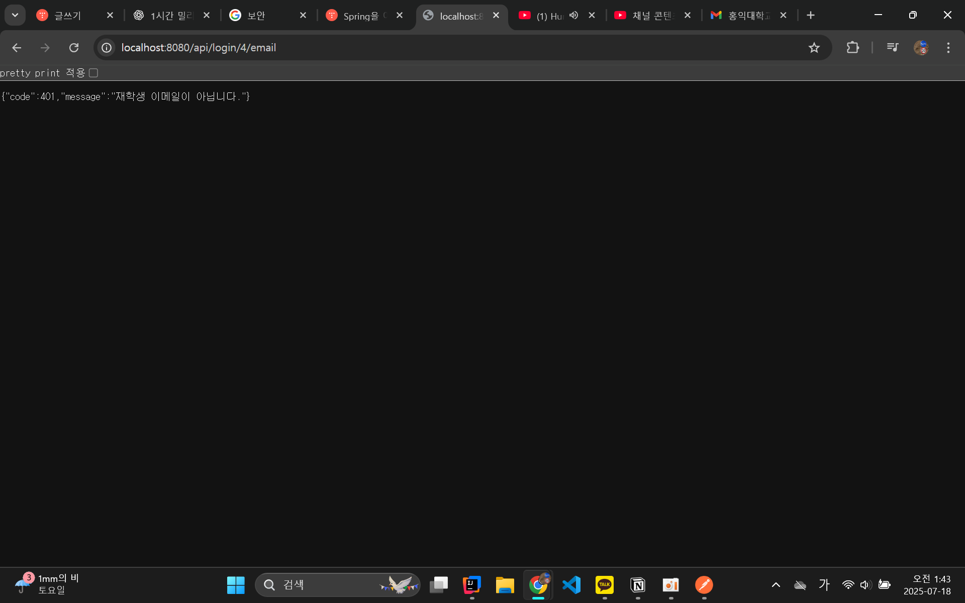 이전에는 JWT 토큰발급과정에서 오류가 생겨서 로그인이 안됐는데.. 다행이다. 또 weakkeyException이 발생했는데 그건 내가 HS512로 JWT 토큰을 발급해서 그런거고.. HS256으로 설정하니까 또 된다. 괜히 유튜브에서 HS256을 쓰라고한게 아니네