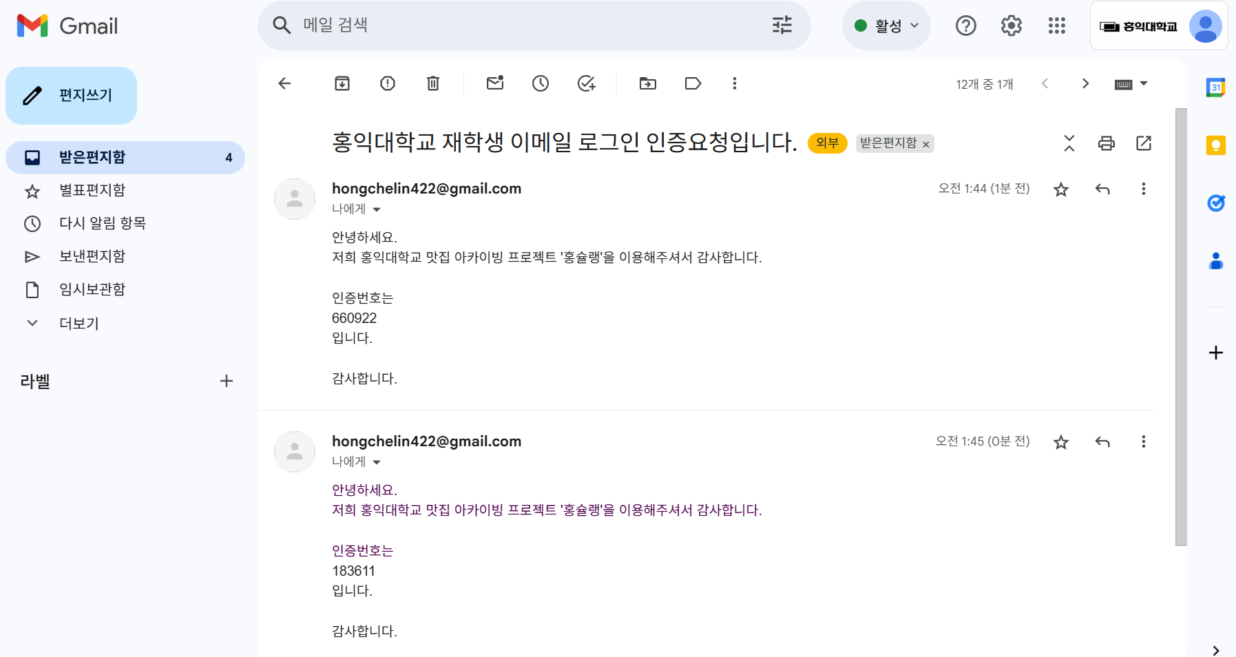 홍대 재학생 계정으로 계정을 바꾸니 또 성공