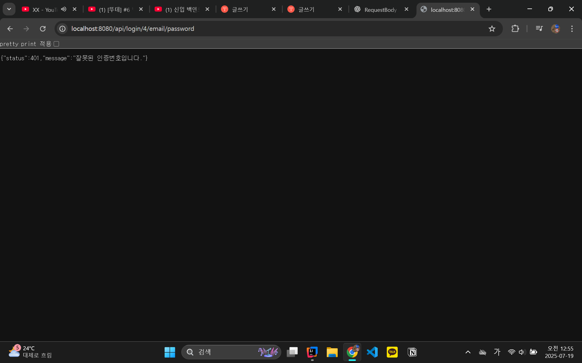 지금 웬만한 기능들은 거의 다 ResponseEntity<ResponseDTO> 형식으로 반환하게 해두어서.. 이제 DB 작업 할 때 외엔 DTO 기능도 거진 만든듯하다. 1시간 정도 걸렸나? 1시간 반?