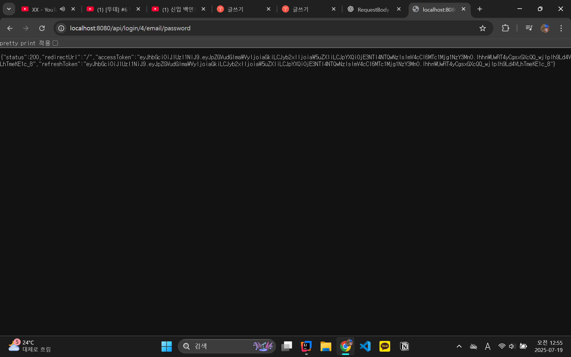 응답으로 응답코드와 메시지, redirect-url은 필수로 들어가고, 로그인의 경우에는 엑세스토큰과 리프레시토큰도 새로 발급해주어야한다. 이정도면 되지 않을까 싶다.