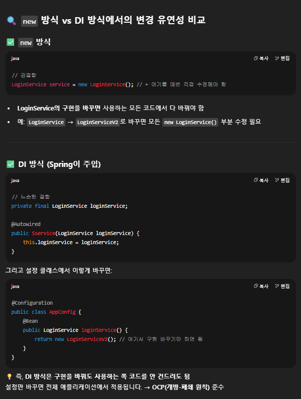 다만 new 방식의 경우에는 Mock 객체를 주입할 수 없으나 빈방식의 경우에는 객체의 인자로 Mock 객체를 줄 수 있다. 즉, new 방식의 경우에는 테스트용 Mock 객체를 주입할 수 없어 빈방식보다 테스트가 어렵다.