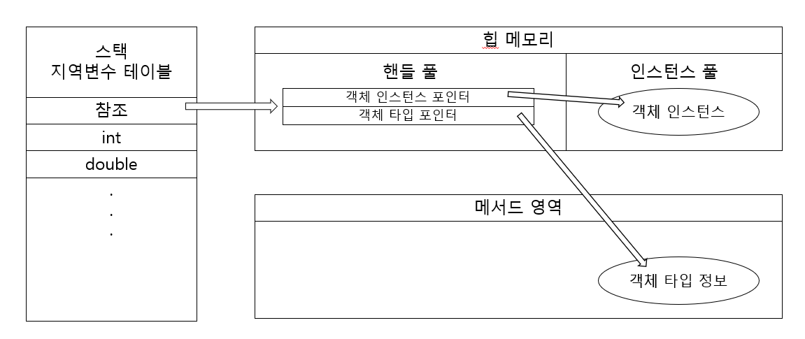 핸들 방식을 사용하면 힙메모리에 핸들 저장용 핸들풀이 따로 존재한다. 스택의 참조변수에는 핸들의 포인터 주소가 저장될 것이고, 핸들은 객체의 인스턴스 데이터를 나타내는 포인터와 객체의 타입에 대한 데이터를 나타내는 포인터로 이루어져 있다.