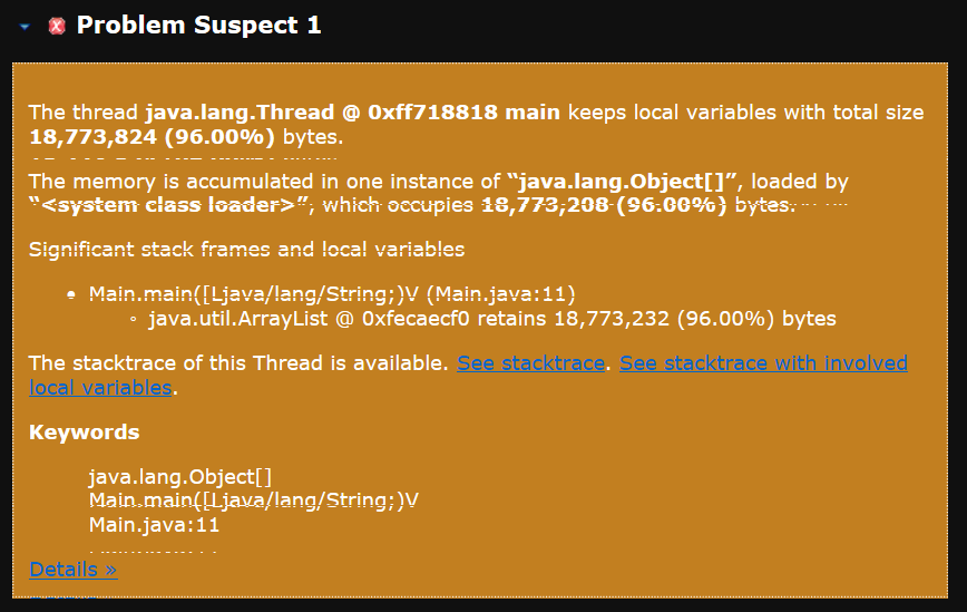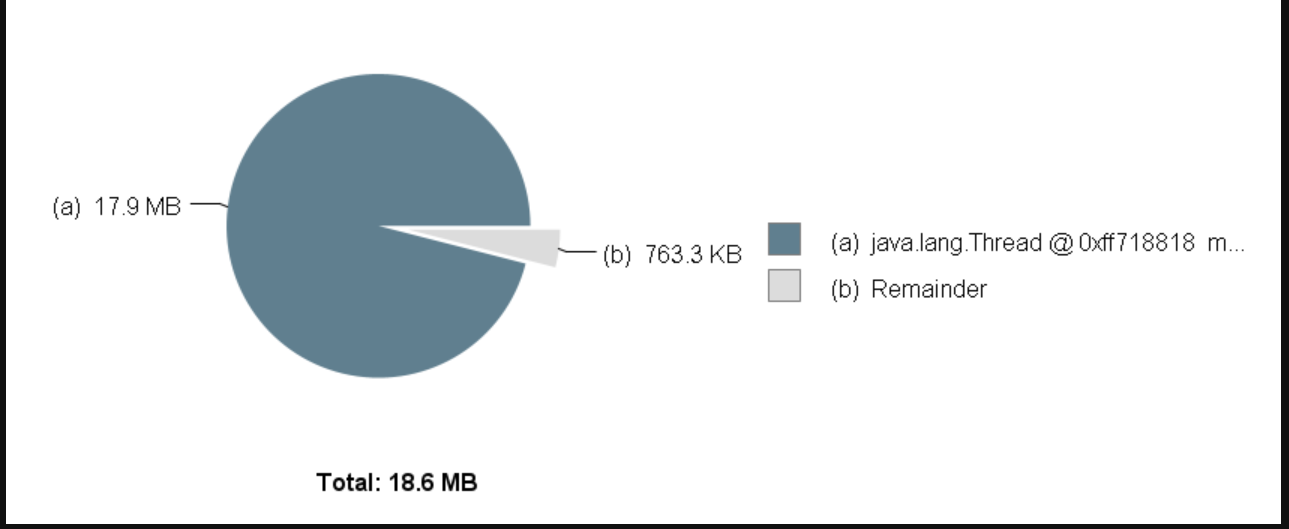 그리고 다시 힙 메모리 오버플로우를 일으키면 MAT을 통해서 누수된 메모리가 어느 객체 때문에 누수되었는지, 어느 스레드에서 누수되었는지 등을 알 수 있다.