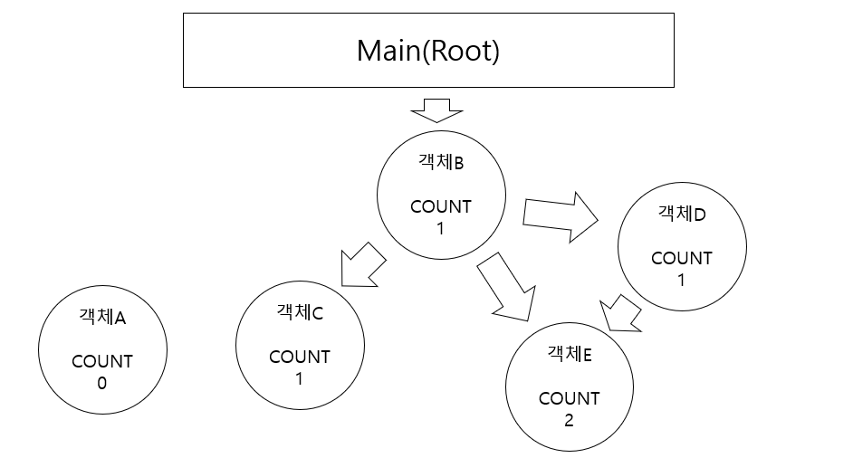 1. 객체를 가리키는 참조 카운터(reference counter)를 추가하고, 참조하는 곳이 하나씩 늘어날 때마다 참조 카운터의 값을 1씩 증가시킨다.