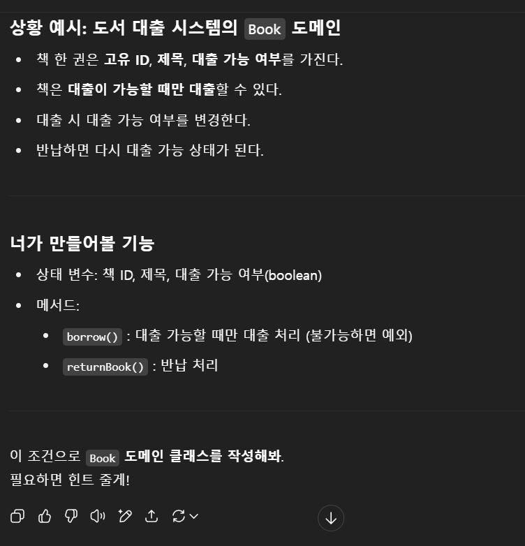 새 Book 객체를 호출할 때마다 새 책이 저장되는 것은 알겠다만.. Book 객체를 식별하긴해야지 식별하지 않는다면 책 한 권 반납했는데 전체 책이 반납처리되고 그런 대참사는 방지해야하기 때문에.. GPT에게 물어보니 도메인에서는 그런 메서드를 처리할 필요가 없고 BookRepository.findById(bookId) 이런 메서드를 쓰면 저장된 특정한 Book 객체를 불러올 수 있다는데 아직 레포지토리 계층에 대해서 심도있게 다뤄보지는 않아서 그냥 그런기능이 있다만하고 넘어갔다.