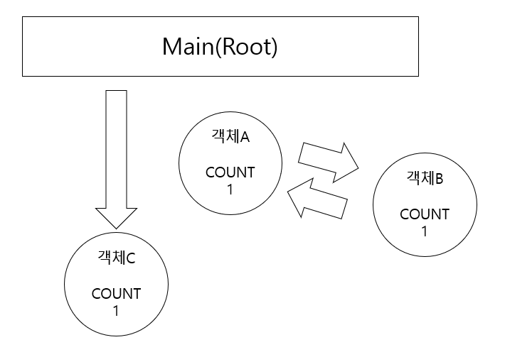 참조가 해제된 여러 객체가 서로를 참조 중일 때, 참조 카운터에 저장되는 값은 참조가 해제되더라도 0이 아니게되고 결국에는 메모리가 회수되지 않는다. GC의 제대로된 목적이 이루어지지 않는 순간.