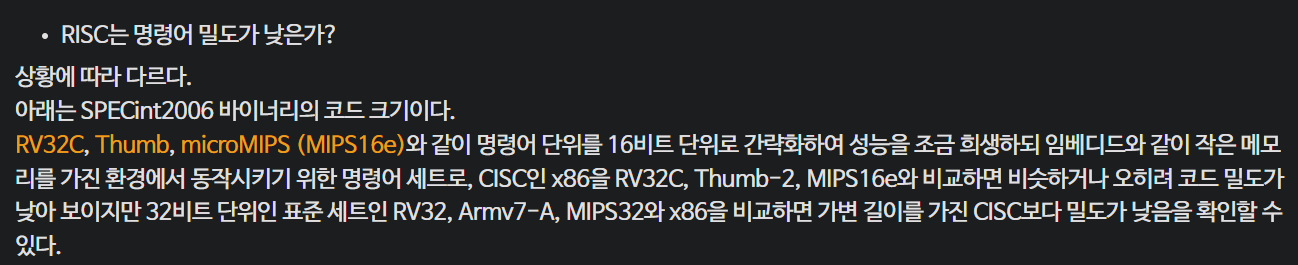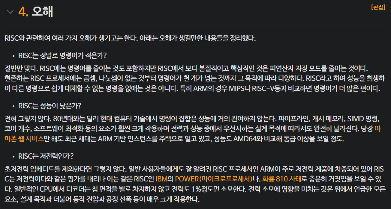 재미로 살펴보니 나무위키에서 RISC 문서가 있어서 살펴보니 이정도의 내용들이 있었다. RISC에 대해서 일반적으로 알려진 오해 정도를 다루고 있다. 믿거나말거나 읽어보면 재밌다.`