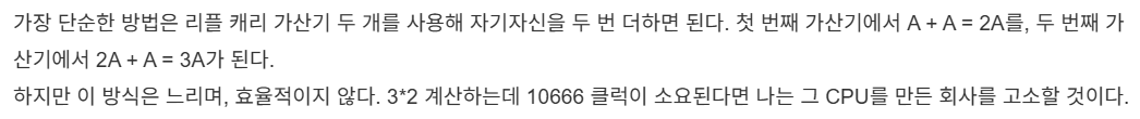 같은 글에서 곱셈을 할 때 리플 캐리 가산기 두 개를 사용하면 속도가 두 배로 느려지므로 그렇게 CPU를 만든 회사를 고소하겠다고했는데, 보조기억장치를 주기억장치로 사용하면 1+1연산에도 훨씬 더 시간이 오래 걸릴 것이다.