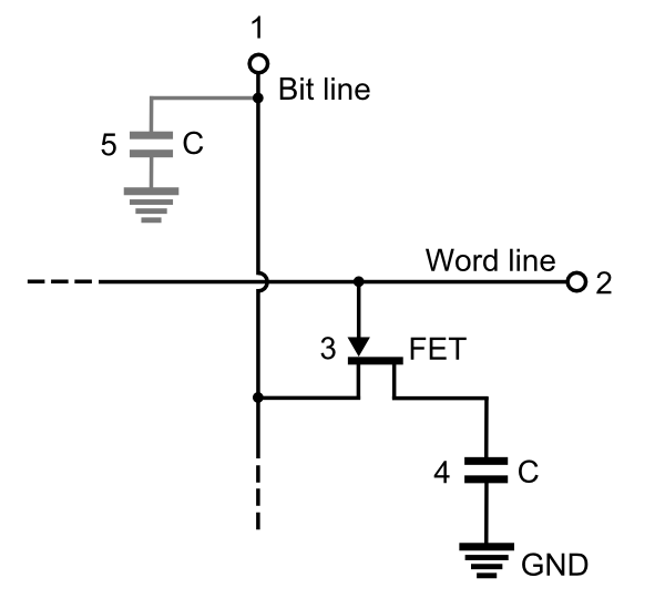 복잡해보이지만 C라고 하는 부분(커패시터, Capacitor)에 1이나 0을 저장한다. 여기서 이제 데이터가 저장되고, 주기적으로 추가해주어야한다. FET는 스위치. 정보를 저장하면 안될 때 정보를 저장하는 불상사를 막기 위해 존재한다. 그래서 정보를 저장할 때 Word line에 전류를 흘러넣어서 스위치를 열고, Bit line에 저장할 정보를 넣거나 가져온다.