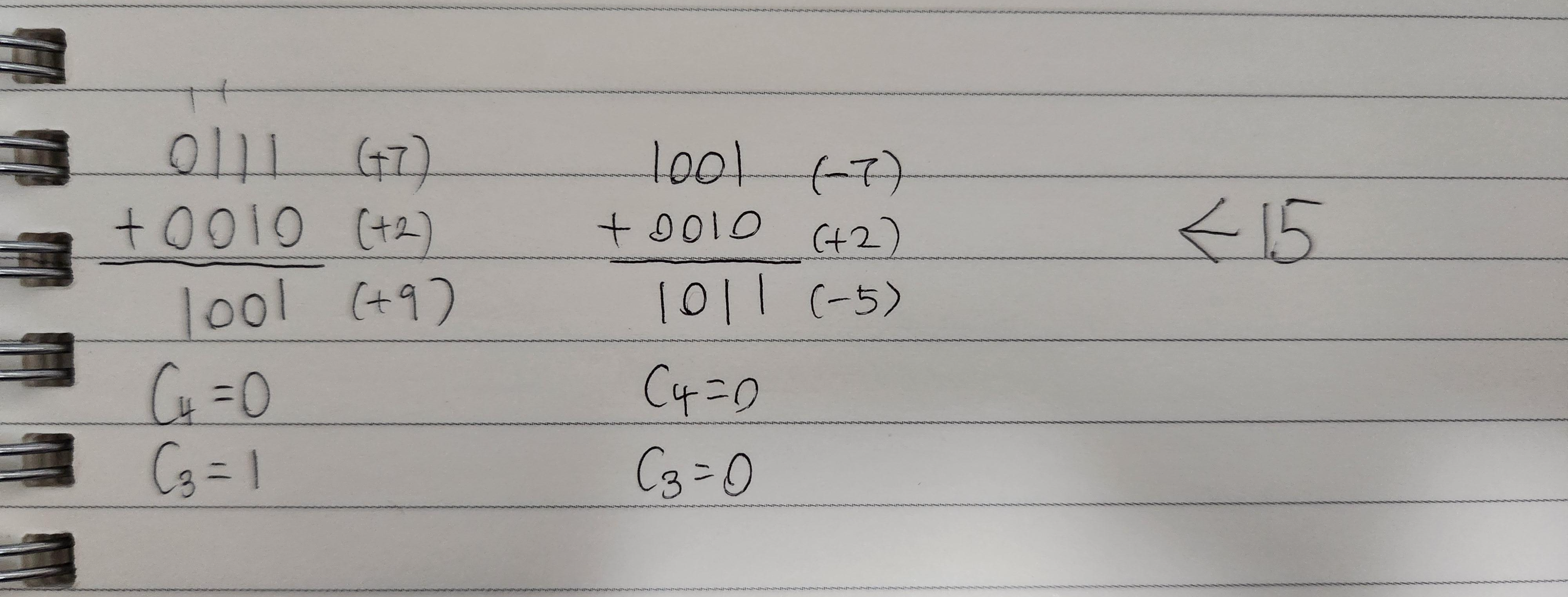 0101 + 1110 = 10011이지만 올림수를 무시해 0011이된다. 이는 5 + (-2) = 3과 일치.