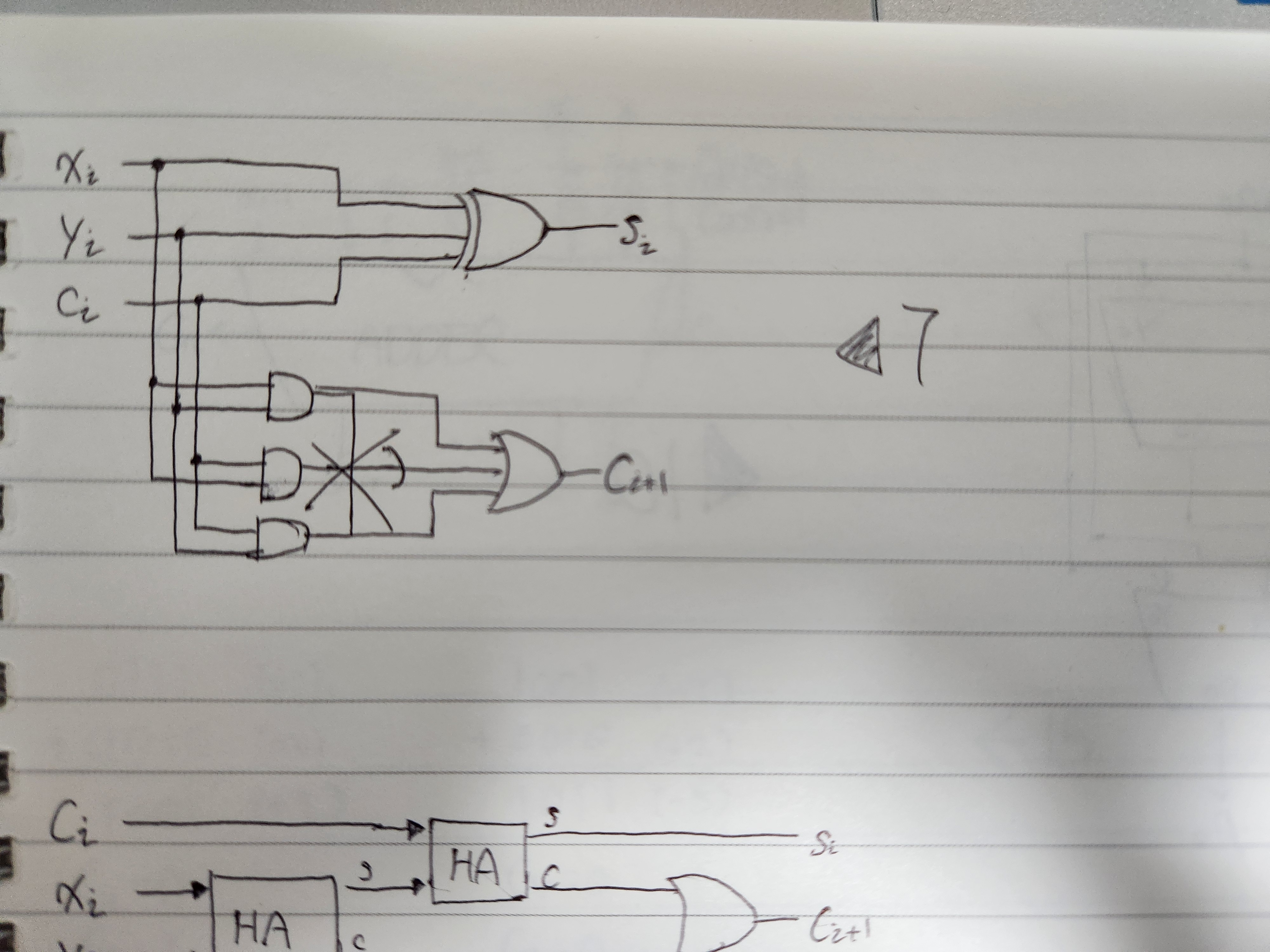 단, 두 반가산기에서 동시에 올림이 1이 발생할 수는 없다. 왜냐하면 두 번째 HA에서 입력값이 둘 다 1이어야하므로 ci = 1, xi + yi 의 s가 1이어야한다. 하지만 xi + yi 반가산기의 c도 1이어야하므로 xi + yi = 11 이라는 결과가 나와야하는데, 이는 논리적으로 불가능하기 때문이다. 1 + 1 = 3이 아니듯이.