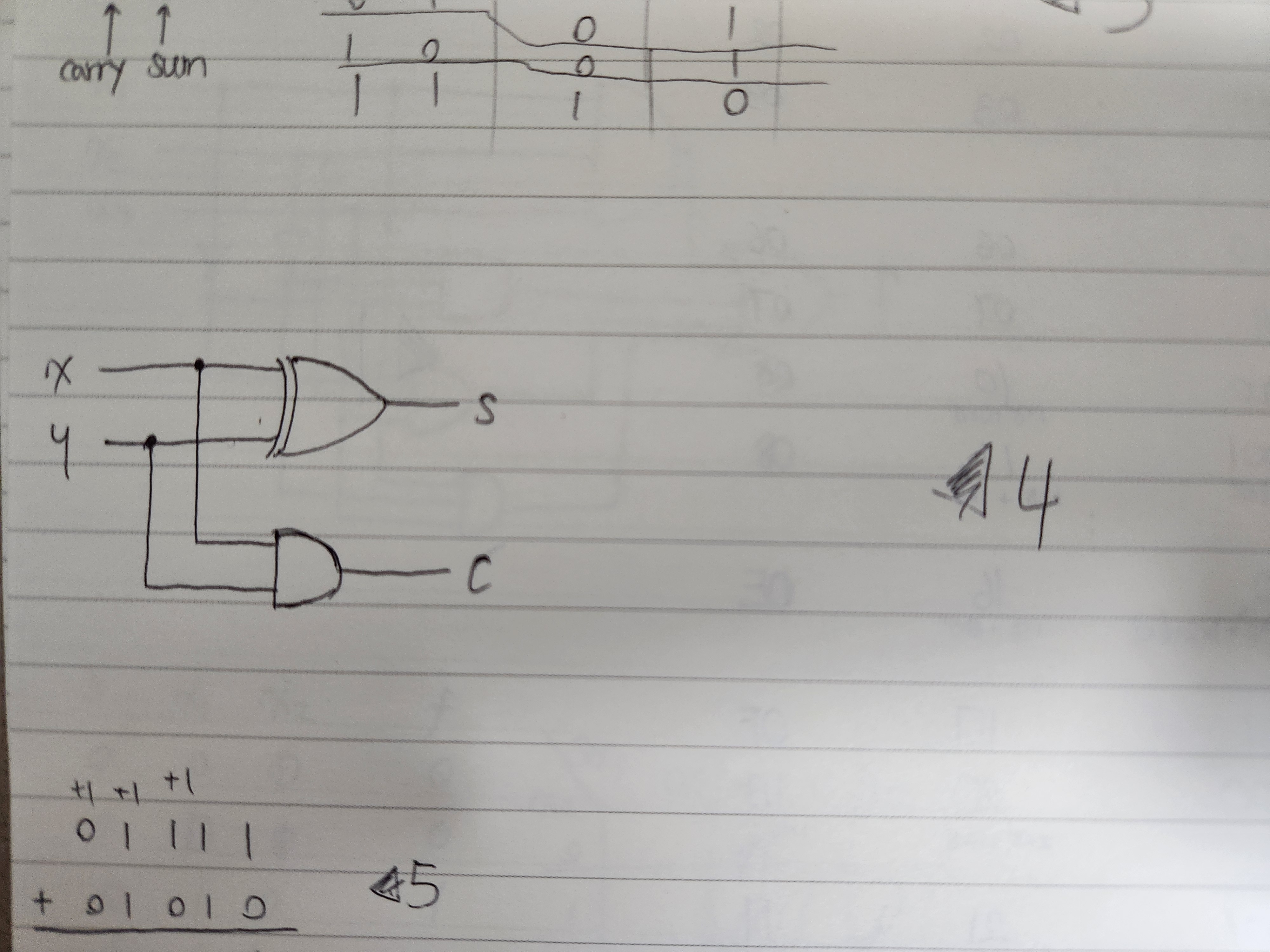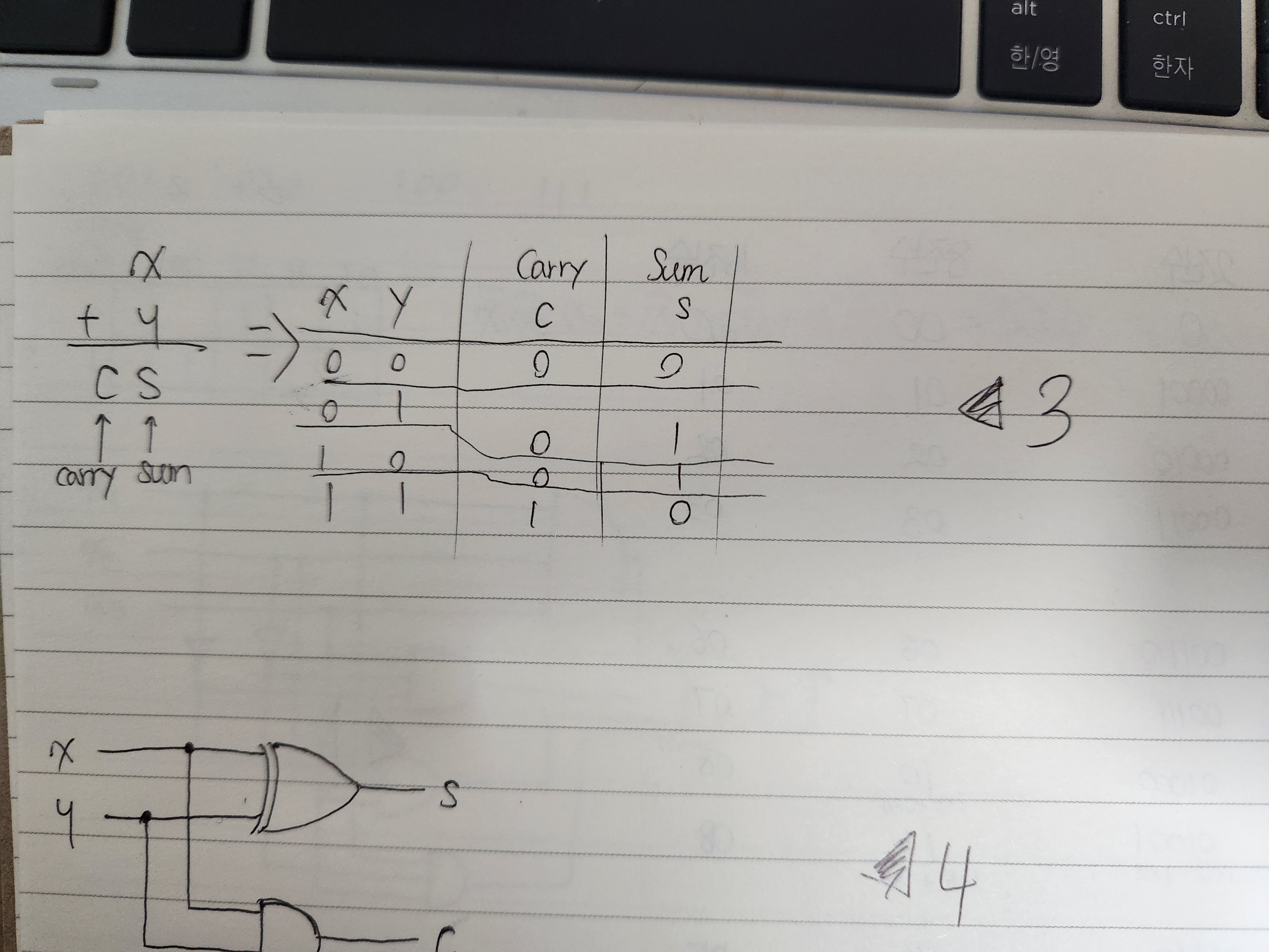 이를 회로로 나타내면 위와 같이 나타낼 수 있으며, 이처럼 단 두개의 비트의 덧셈을 구현하는 회로를 반가산기(half-adder)라고한다.