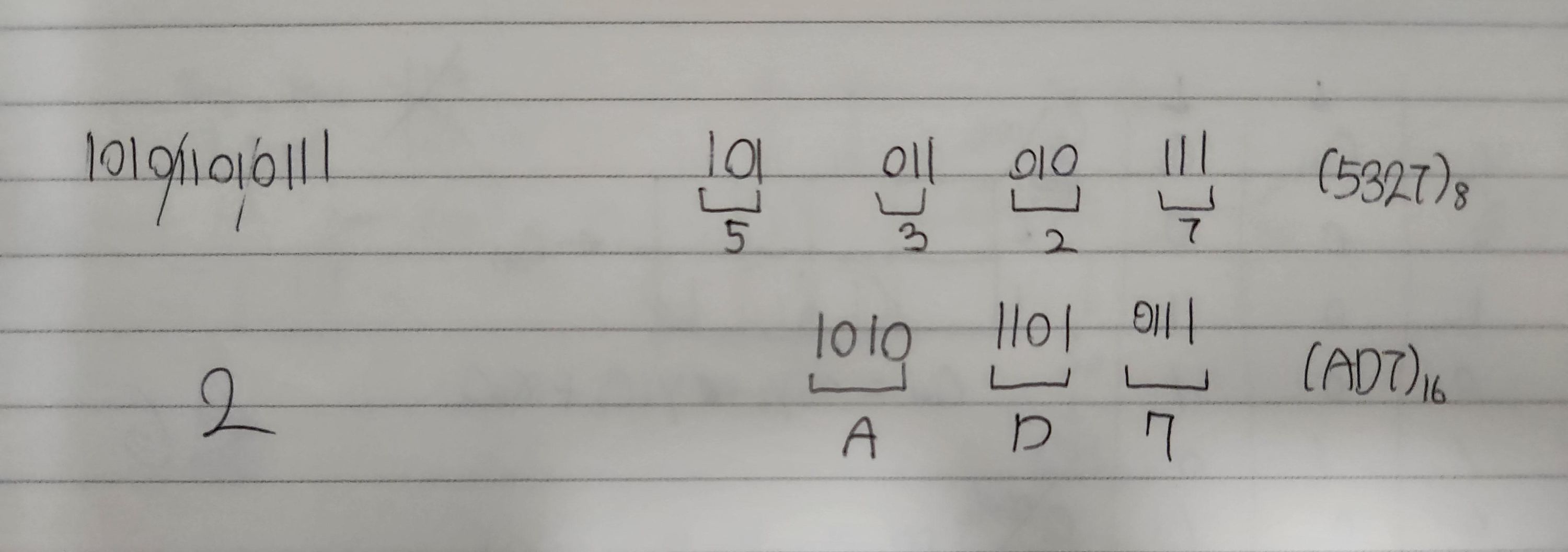 하지만 8진수의 경우에는 2진수의 비트 세 개를, 16진수의 경우에는 2진수의 비트 네 개를 최하위비트(오른쪽부터, LSB, Least-Significant Bit)에서부터 묶어서 각각 8진수와 16진수에 대응시킬 수 있다. 따라서 2진수 101011010111은 8진수 5327, 16진수 AD7로 더 깔끔하게 처리할 수 있다.