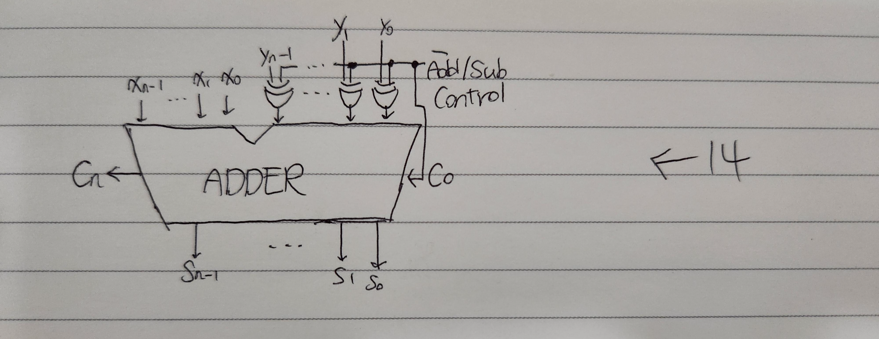 앞서 XOR 연산을 통해서 하나의 입력에 따라 다른 입력값의 실제 값과 보수 값을 조정할 수 있다고했다. 위의 예시에서는 ci 값에 따라서 xi XOR yi 의 값의 보수 여부가 변했다. 따라서 이를 적용시켜보자면 0일 때 덧셈이 일어나도록, 1일 때 뺄셈이 일어나도록하는 제어 신호를 Add/Sub이라고 칭한다. (Add 위에 줄이 그어져있으나 컴퓨터 상에서는 이를 표현할 수 없어서 생략하도록 한다.)