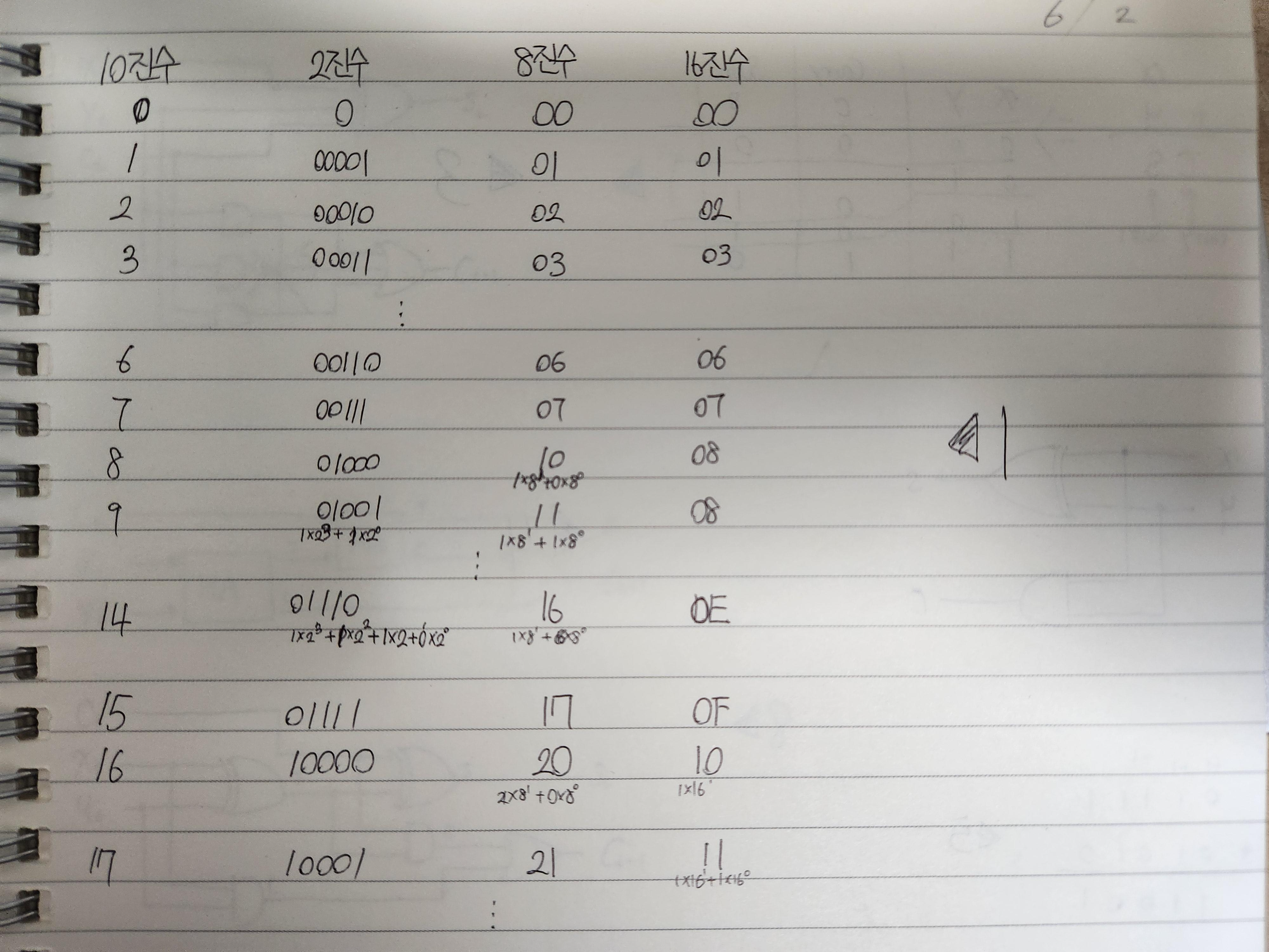 가령 십진수 5는 이진수로 나타내면 1 * 2^2 + 0 * 2^1 + 1 * 2^0 이므로 101로 표현하는 것처럼. 이는 2진수 뿐 아니라 8진수와 16진수에도 해당하는 사항이다. 또한 16진수에서 0에서 9까지는 10진수와 동일하게, 이후로는 A, B, C, D, E, F로 15까지 표현할 수 있다.
