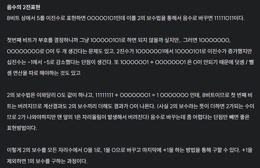 따라서 2의 보수로 나타내는 과정이 1의 보수보다는 다소 복잡하지만, 2의 보수의 덧셈과정은 1의 보수보다 간단하다.