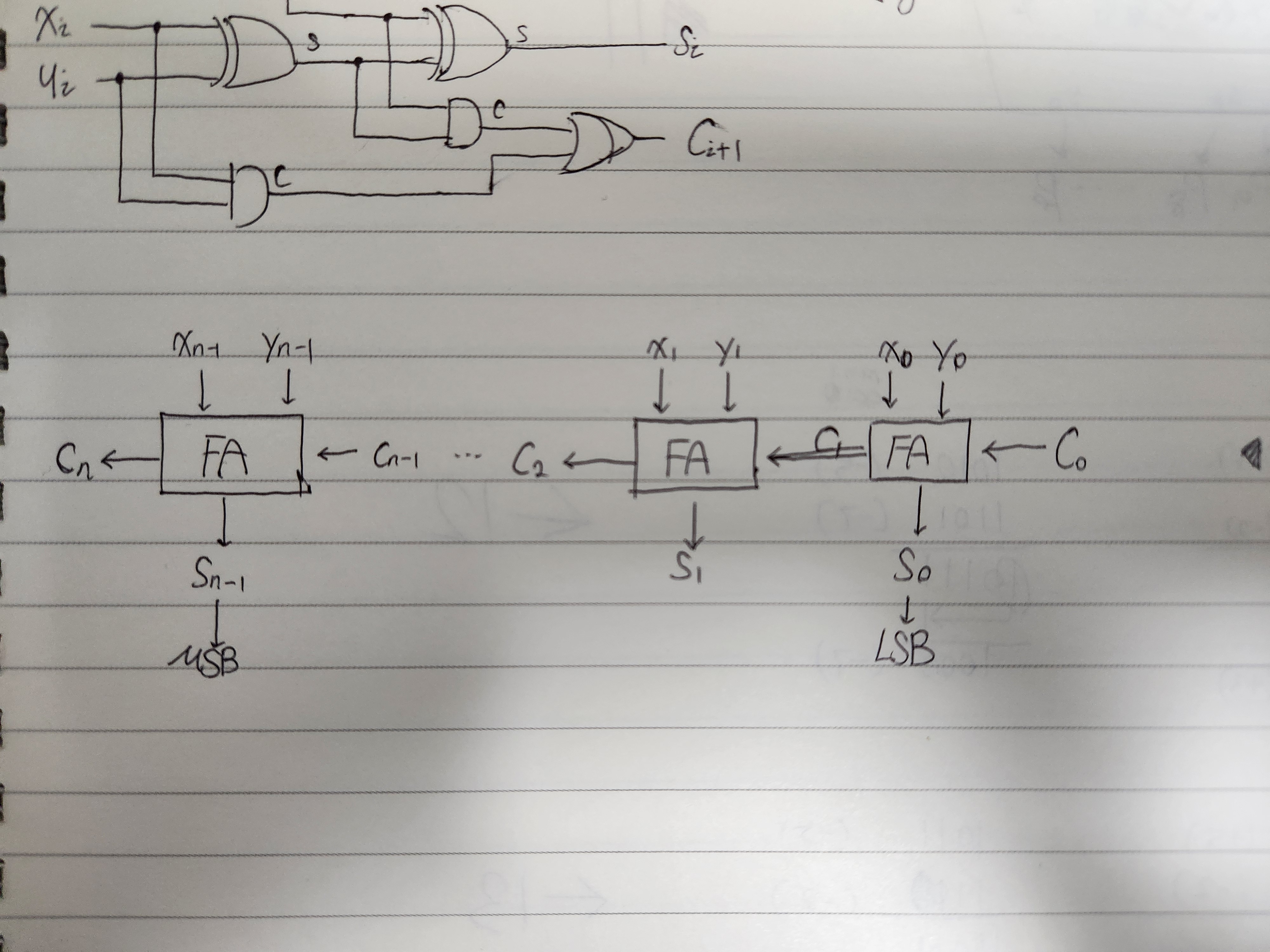 다시 한 번 생각해보면, 0번째 비트, 그러니까 맨 오른쪽 비트는 어차피 올림수가 발생하지 않으므로 반가산기로 처리가능하다. 그 후, i번째 비트에서는 올림수가 발생할 수 있으므로 반가산기로 처리할 수 없다. 또한 i번째 비트에서는 xi + yi 뿐 아니라 올림수 ci 도 덧셈에 참여한다.