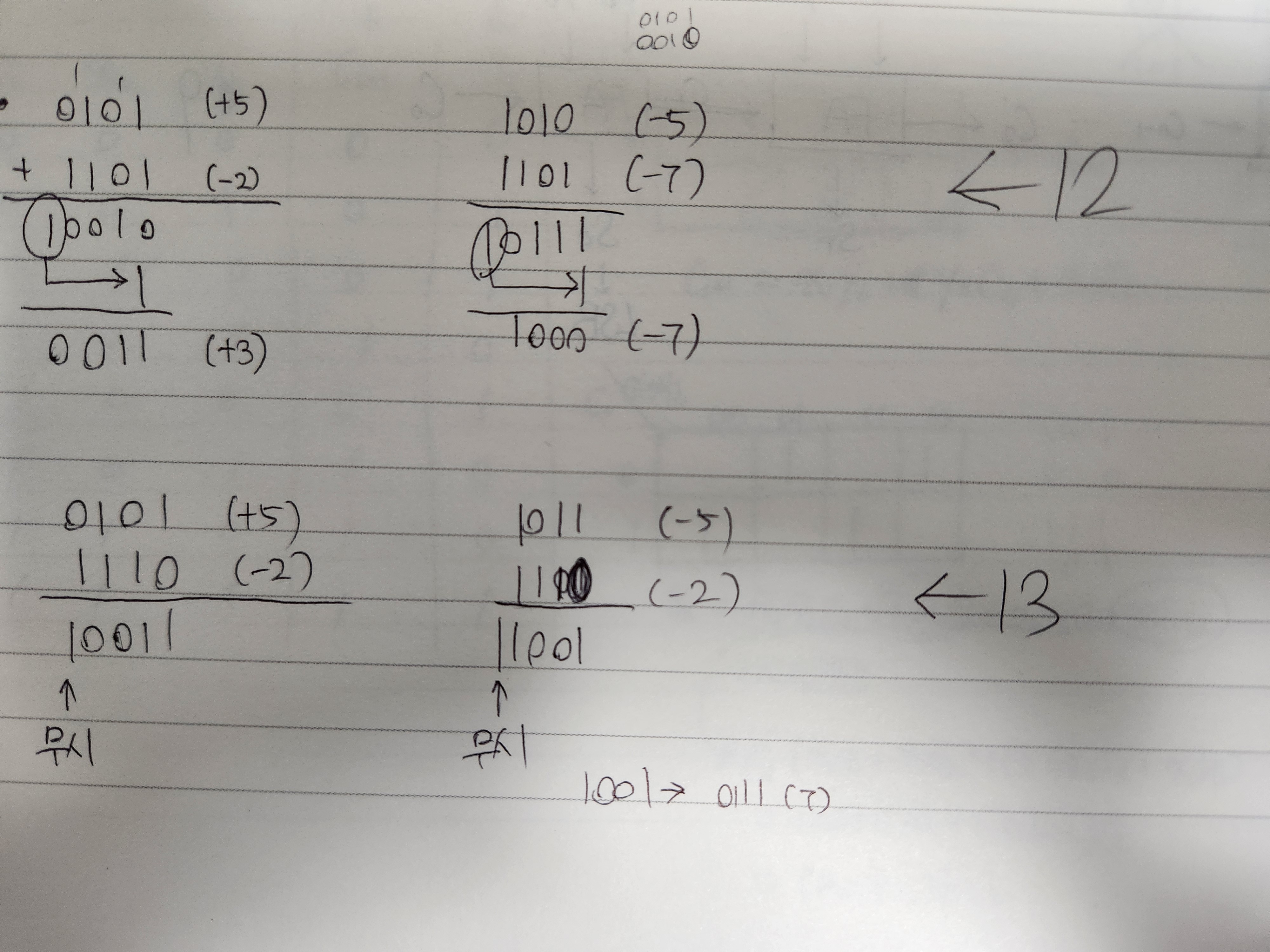 또한 음수끼리의 덧셈의 경우에도 마찬가지인데, 올림때문에 1010 + 1101 = 10111 (-5 + (-2) = 23)이 된다. 따라서 올려진 수를 LSB에 더해서 1000으로 올바른 값을 구해야한다.