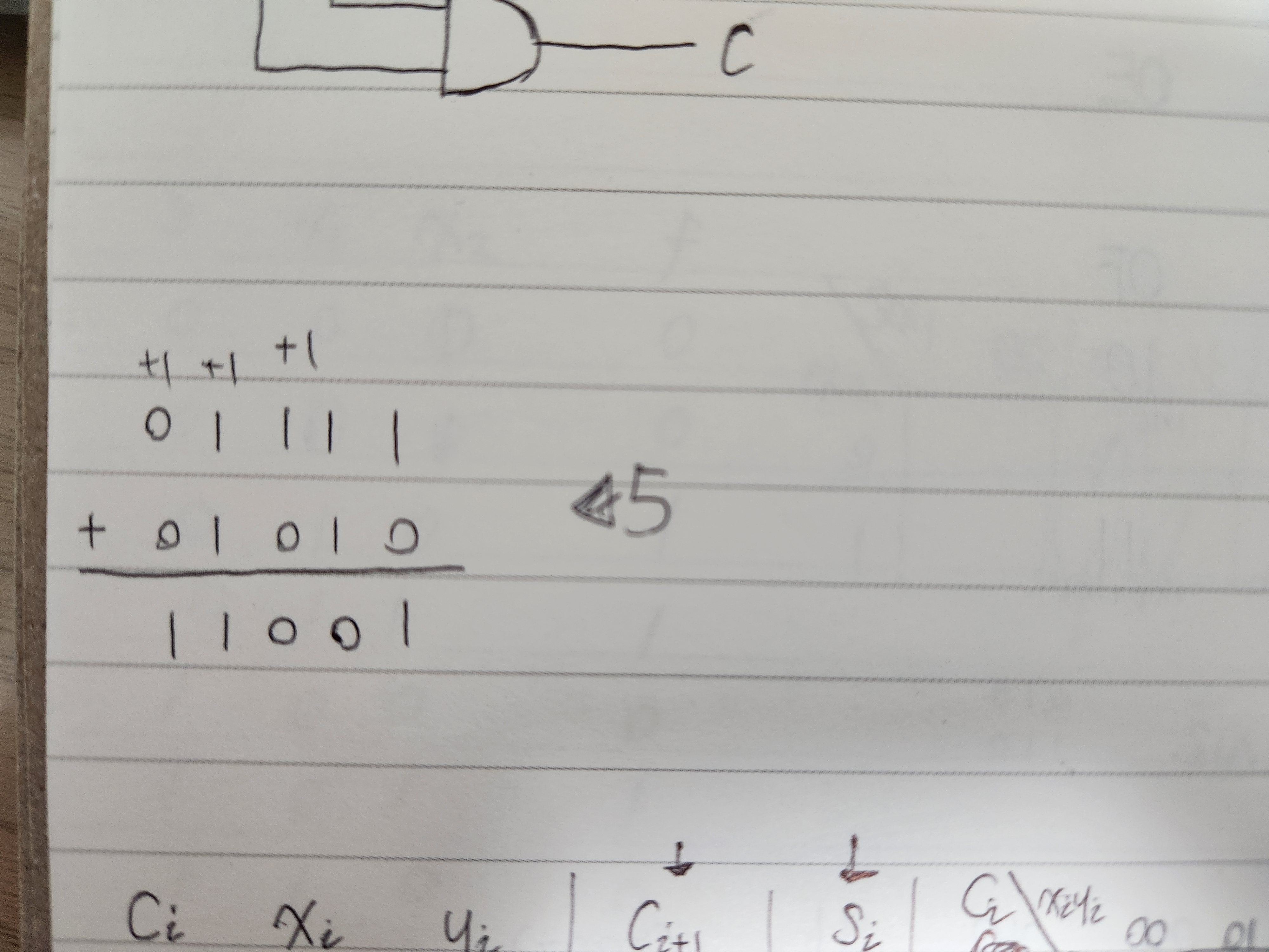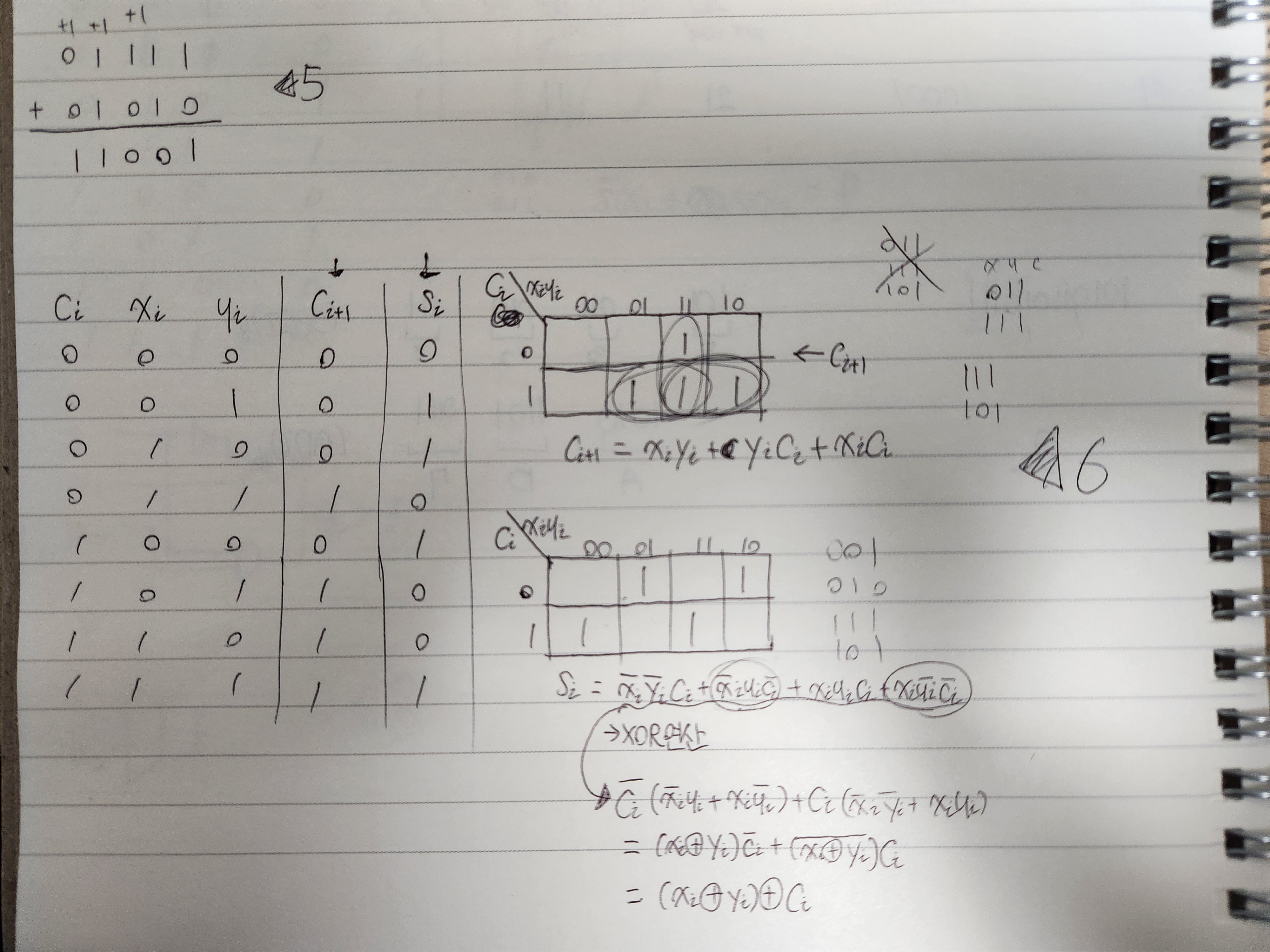 먼저 다음자리수에 영향을 미칠 올림수부터 계산해보면 xiyi + xici + yici 로 계산이 되고, 그 다음에 현재 자리수의 결과가될 si는, 001 010 111 100에서만 결과가 1, 그러니가 홀수 개의 변수가 1일 때 값이 1이다. 이를 XOR 연산으로 칭한다.