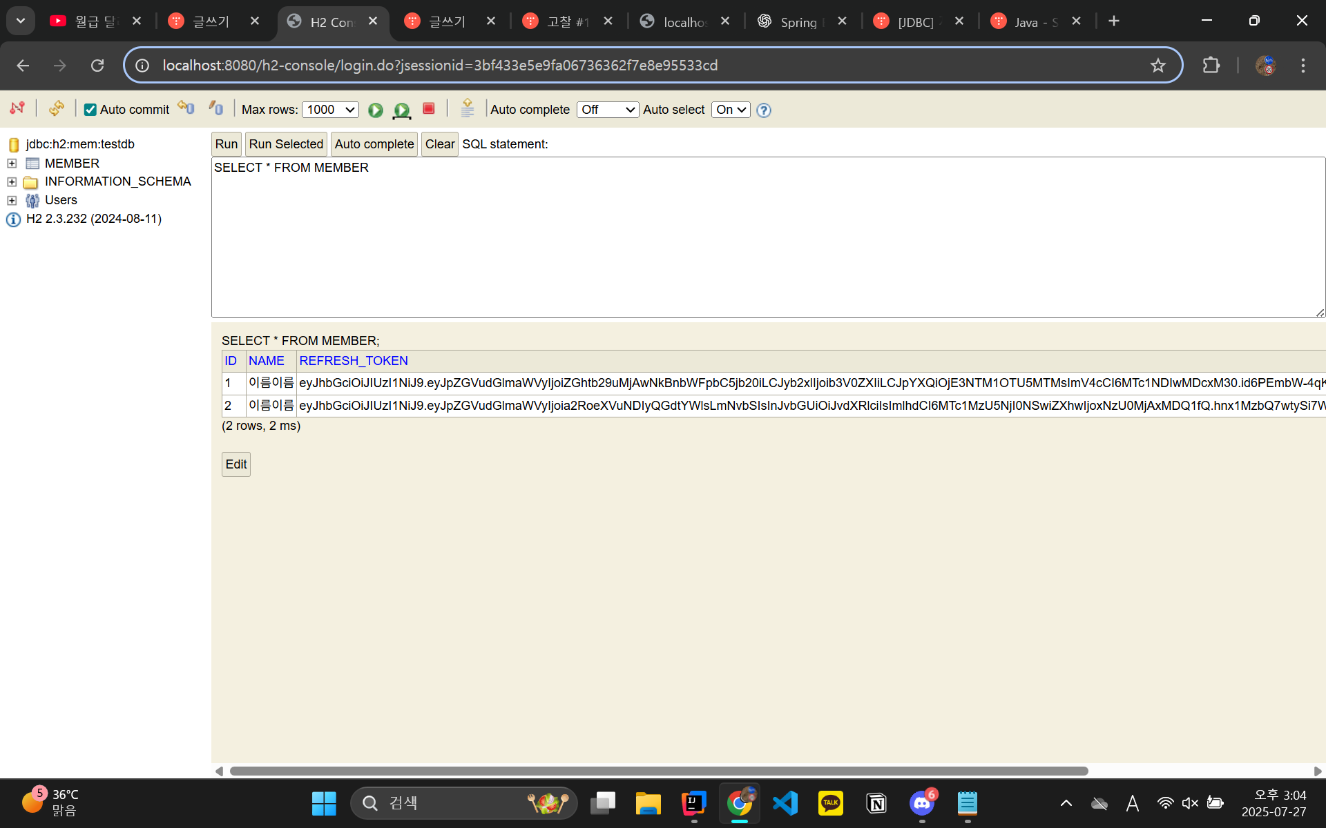 NAME에는 사용자가 직접 설정한 닉네임이 들어갈 예정이다. 지금은 REFRESH_TOKEN의 값이 다른 것으로 구별하면 됨