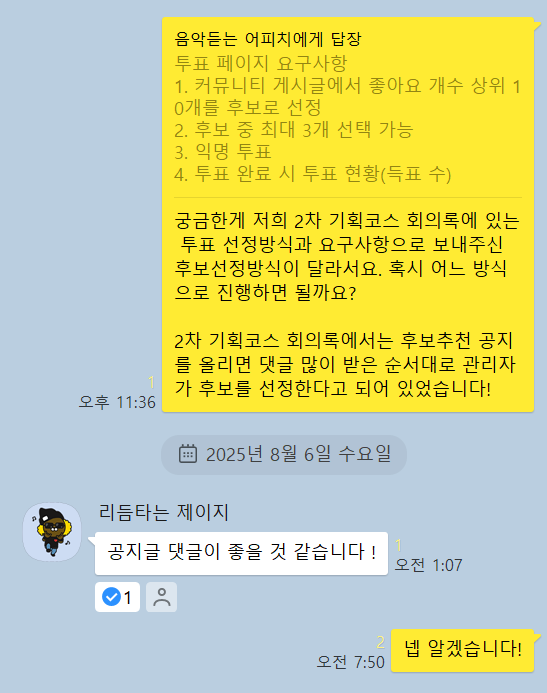 아마 어려운 순으로 해보려면 투표기능 자동초기화-나의투표기록-월별투표기록 순으로 개발을 해보면 좋을 것 같다.