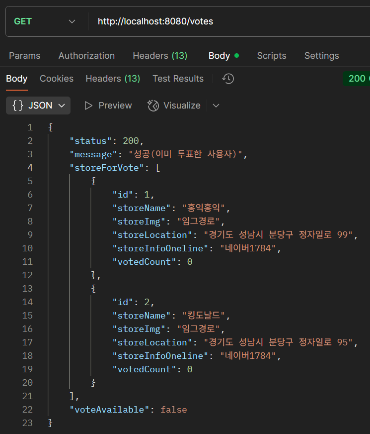 테스트 한 번에 회원가입도 하고 로그인도 하고 상점DB에 상점도 등록하고 STORE_FOR_VOTE DB에 가게를 등록해야 서비스 기본세팅이 끝난다. classpath에 SQL문 하나를 넣거나 main 메서드에 save하도록 기본적으로 추가하면 테스트가 곰방곰방 끝나는데 귀찮아서 그냥 POSTMAN으로 처리하는 중