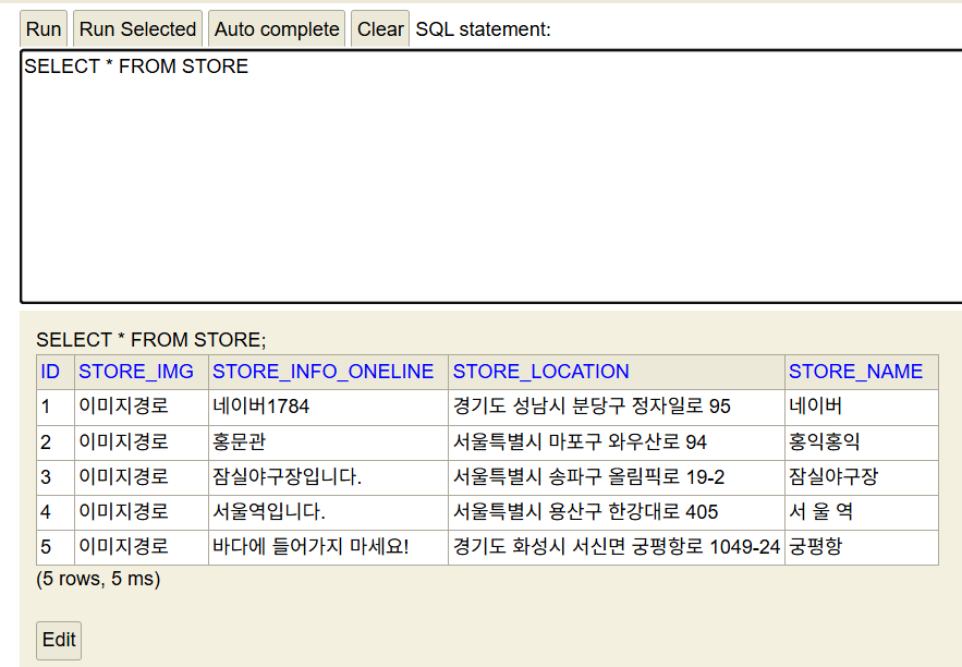 그냥 임의의 가상의 가게 5개를 저장하는 코드를 만들어두었다.