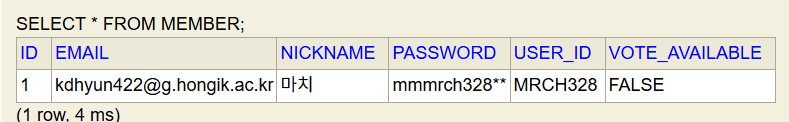 저 코드에서 추가로 Member DB의 투표여부를 저장하는 isVoted 변수를 isVoteAvailable 로 변경했다. 좀 더 직관적으로 알아챌 수 있도록.. VoteAvailable이 true면 투표가 가능하고, false면 투표가 불가능하다.