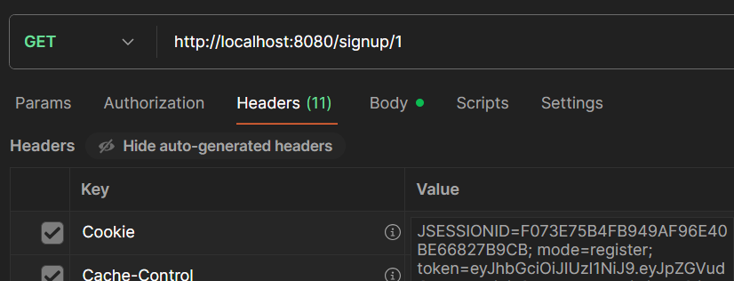 그리고 테스트하려는데 이게 헤더에 접근해서 토큰을 넣어주고 해야하는거라 진짜 테스트는 못한다. 다만 토큰을 꺼내서 쿠키에 저장하는 것까지는 가능하다. 여기까지는 POSTMAN으로 처리할 수 있으니..
