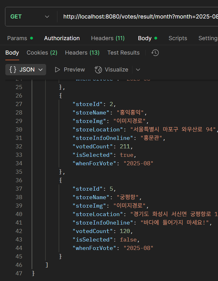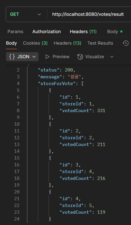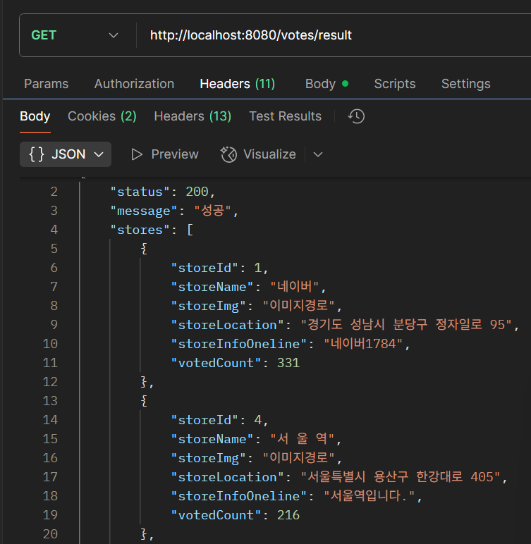 참고로 storeConverterService.convert(voteList) 메서드는 ResponseEntity를 반환하기 때문에 getBody를 통해서 DTO만 가져오도록 했다.