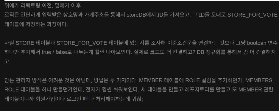 위에서나 다른 GDG 포스팅 등에서 나왔지만 /votes URL로 body에 투표할 가게들의 아이디를 votedIdList를 담아 전해주는데, 이 아이디가 'STORE_FOR_VOTE' 테이블에 등록된 가게의 아이디인지, STORE 테이블에 등록된 아이디인지를 명확히 정하지 않고 넘어갔다.