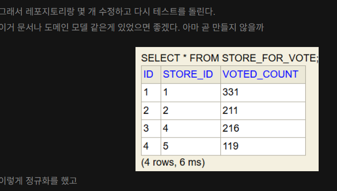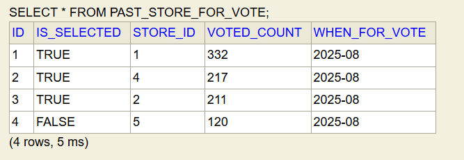 목록을 출력해야할 때는 STORE 테이블에서 가게정보를 가져와야하고, 테이블에는 정규화를 위해서 아이디와 득표수만 지정해야한다. (위의 STORE_FOR_VOTE 테이블을 형태를 유지해야함)
