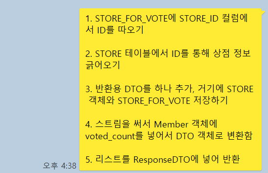 이를 당연히 지금처럼 STORE_FOR_VOTE의 요소들을 순회하면서 하나씩 출력하는 것은 안되고, 출력용 DTO 하나를 만든 다음에 저 STORE_FOR_VOTE 요소들의 ID를 가져와서 STORE 테이블을 조회해 정보를 빼내고 DTO에 담아서 최종적으로는 DTO를 반환하면 된다.