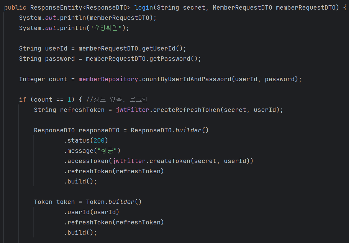public ResponseEntity<ResponseDTO> login(String secret, MemberRequestDTO memberRequestDTO) {
