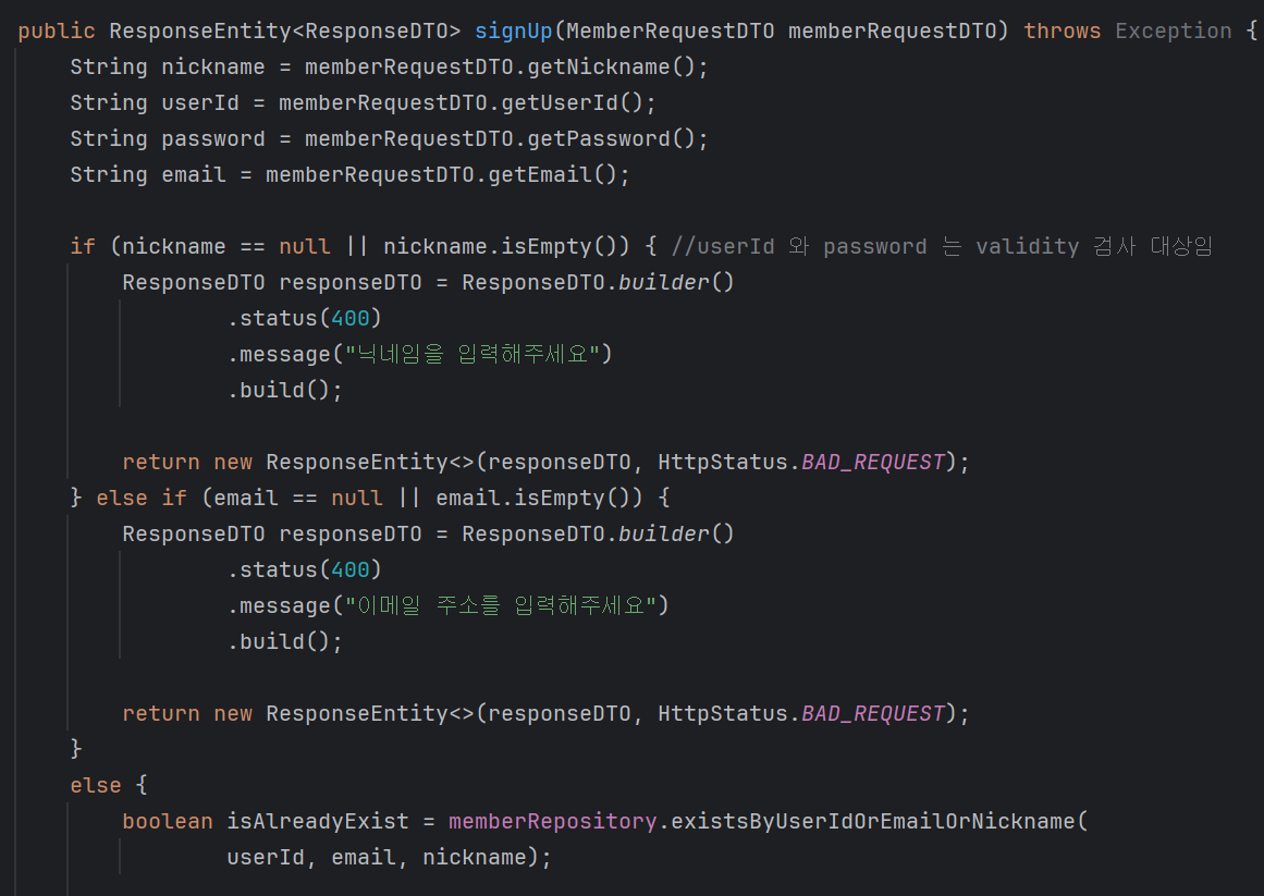 public ResponseEntity<ResponseDTO> signUp(MemberRequestDTO memberRequestDTO) throws Exception {
