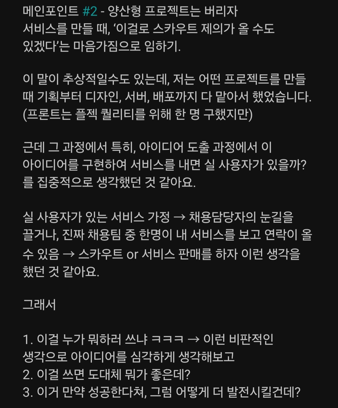 이거와 함께 에타에 선배님이 쓰신 장문의 프로젝트 관련 글이 있어 읽어보고 든 생각은