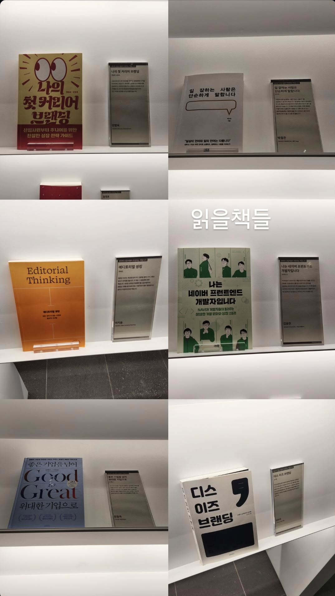 커넥트 라운지에서 신입사원 추천도서가 있길래 읽을만한 책을 몇 권 확인했다. 우선 저 책들이랑 MVP와 기획 관련된 책부터 읽어보려한다. 린 스타트업과 스프린트 한 번 읽어보려 함