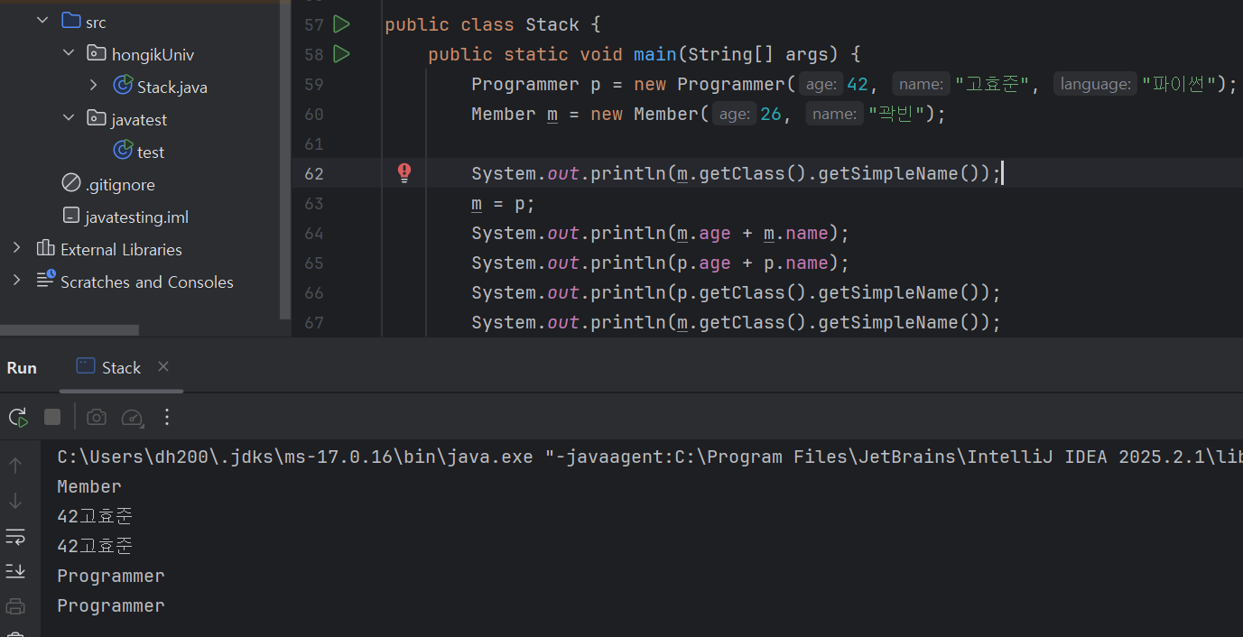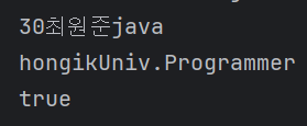실제 클래스 이름은 hongikUniv.Programmer (패키지명이 hongikUniv)고 Object 클래스와 instanceof 연산을 수행했더니 true가 반환되었다. 즉, instanceof 연산자를 사용하면 상위클래스와도 연산을 진행하면 true가 반환된다. 또한 true가 반환되었다는 뜻은 해당타입으로 형변환을 진행해도 문제될 것이 없다는 뜻이다.