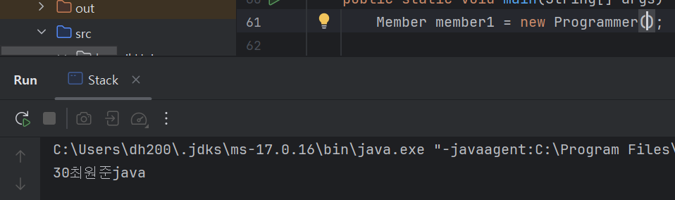 객체가 Programmer로 선언되면 조건문에 걸려서 자바가 가능한 30세 최원준 객체가 반환된다.