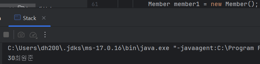 인스턴스의 생성을 기본생성자가 담당하고 있기 때문에 Member 객체를 생성하여 조건문에 넣으면 else 부분에 걸려서 30세 최원준 객체가 반환된다